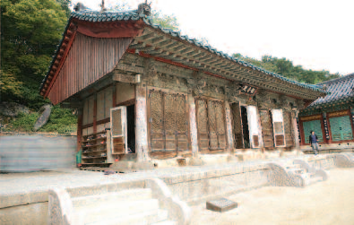 내부의 불단에는 여러 가지 꽃무늬와 비천상들을 화려하게 조각 장식하였다. 위의 닫집이 매우 화려하고, 아래는 용과 봉황이 구름 속에서 노니는 모습을 실감나게 조각해 놓았다. 동·서벽에는 동방 약사삼존과 서방 미타삼존을 벽화로 그려 석가 세존과 함께 삼계여래(三界如來)를 상징하고 있다.