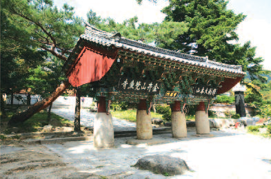 일주문을 지나 13단의 높은 돌계단을 오르면 축대 위에 사천왕상을 모신 사천왕문이 있다. 사천왕은 동서남북의 사방에서 불법을 지키는 수호신이다. 정면 3칸, 측면 2칸에 겹처마 맞배지붕인 사천왕문 안에는 험상궂은 표정으로 각각 비파와 칼 여의주 탑을 들고 서있는 사천왕상 4위가 좌우의 협간에 봉안되어 있고 중앙이 통로다.