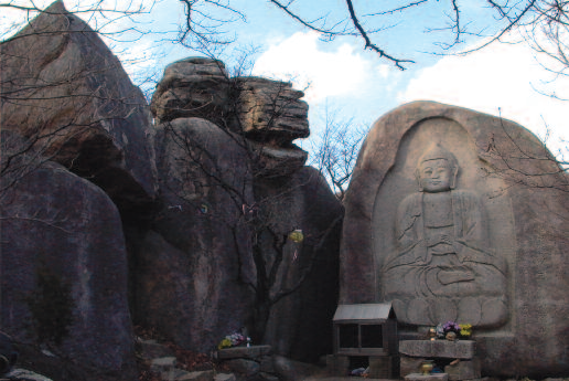 철조망을 오른쪽에 끼고 길 따라 조금 내려가다 겨울에는 얼어붙지만 다른 철에는 제법 시원한 물이 나오는 옹달샘을 지나면 문처럼 생긴 바위를 만나게 된다. 바위 사이로 들어서면 남향의 바위에 미륵불을 양각해 놓았다.