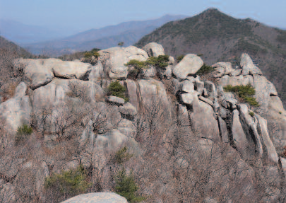 사기바위에서부터 바위와 나무 사이를 이리저리 돌며 올라야 한다. 석문까지의 10분정도는 소나무와 바위가 어우러져 펼쳐내는 아름다움을 즐길 줄 안다면 그다지 힘들지 않을 것이다. 특히 석문이 가까워지면서 두 서너 곳 바위와 소나무가 조화를 이룬 모습은 조금도 눈에 그슬리지 않는다. 이를 두고 대교약졸(大巧若拙)이라고 한다든가.