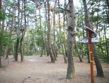 산에 들어서서 30m 오르면 등산로는 오른쪽의 큰길과 왼쪽 소로로 갈라진다.