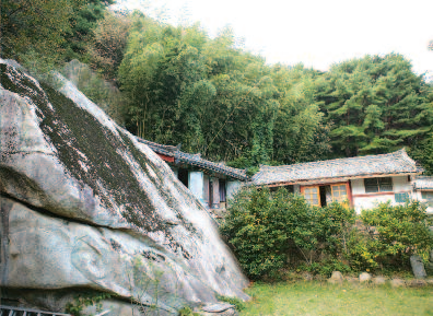 칠판바위에서 10m정도 지나 갈림길의 왼쪽으로 오르다 오른쪽에 서있는 2m정도의 바위를 돌아보면 음각된 寺基(사기)라는 글을 볼 수 있다. 여기서 5분 쯤 바위사이를 돌아 오르면 정원처럼 소나무와 바위들이 어울린 쉼터가 나온다.