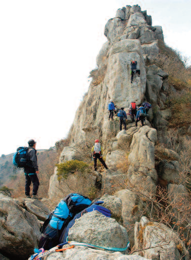 제6피치의 뜀바위는 자신없는 사람은 앞에서 확보상태로 넘어서는 것이 안전하다.