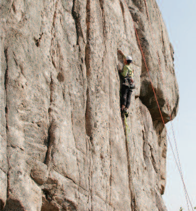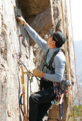 <저승사자(5.11d)> 길이 10m에 경사는 90도에 가깝다. 유리처럼 매끄러운 직벽으로 본격적인 페이스 등반의 묘미를 즐길 수 있는 코스다. 루트 끝에 쌍볼트가 있다.