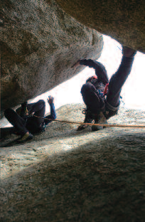 <지옥문길(5.9)> 남벽 제일 왼쪽에 있는 루트로 길이 8m, 경사는 80도가 조금 넘는다. 볼트가 2개 있지만 프렌드를 준비하는 게 좋다. 루트 끝에 있는 소나무를 이용해 하강하거나 확보할 수 있다.