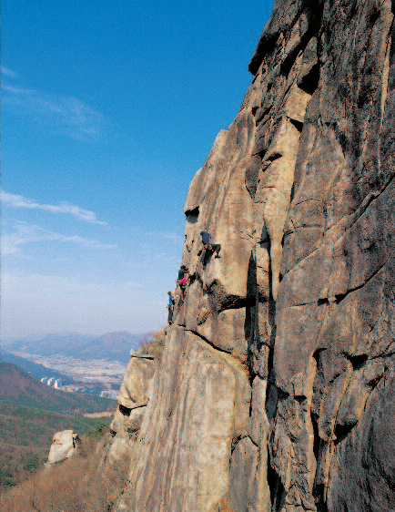 <시선길(5.10b)> 1988년 9월 개척된 18m의 슬랩과 크랙루트다. 고도의 페이스 클라이밍 밸런스와 체중이동 맨틀링의 테크닉을 종합할 수 있다. 볼트 2개가 있지만 두 번째 볼트를 넘어서 10m간은 확보물이 없다.
