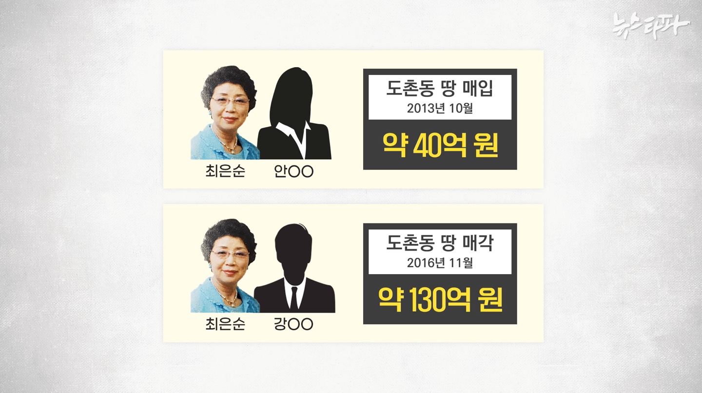 윤석열 대통령의 장모 최은순 씨는 2013년 10월 최초 동업자 안모 씨와 도촌동 땅을 사들인 뒤, 안 씨를 쫓아내고 새로운 동업자 강모 씨와 도촌동 땅을 재취득해 매각했다. 이 과정에서 최은순 씨는 45억 원 가량의 시세차익을 거뒀다.