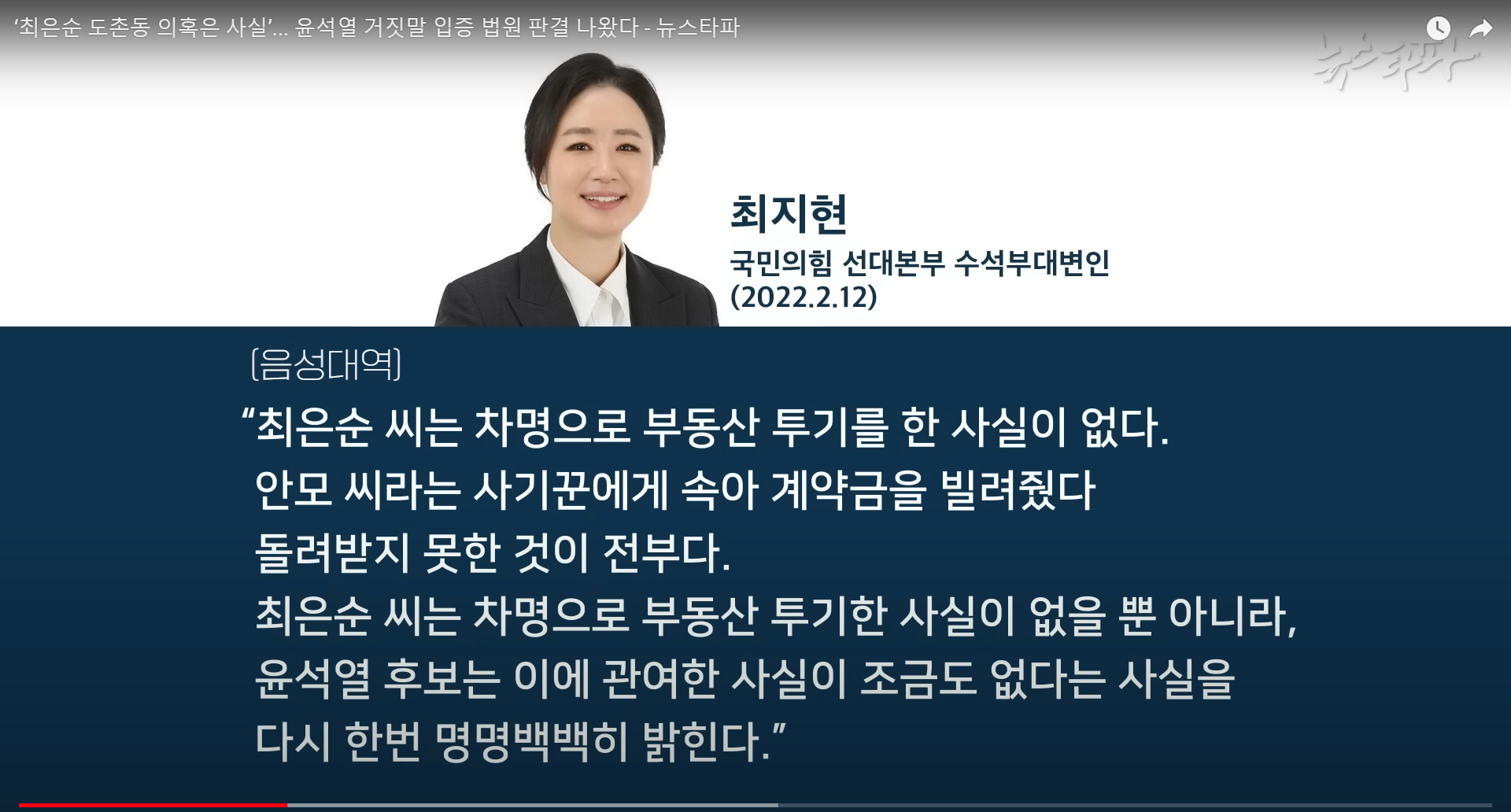 윤석열 대통령은 국민의힘 대선 후보가 된 뒤인 지난해 2월에도 같은 주장을 되풀이했다. 주장의 핵심은 "최은순 씨는 차명으로 부동산 투기를 한 사실이 없다"는 것이었다.