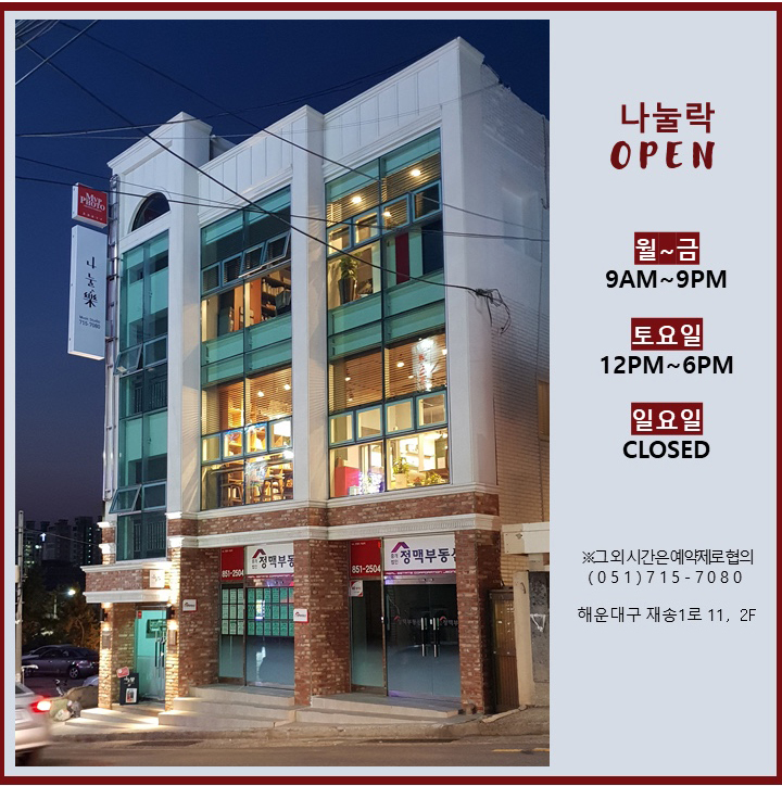 7. 주소 : 부산시 해운대구 재송1로 11, 2층 , 051-715-7080, Mail. nanulak7080@gmail.com