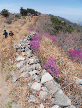 바위가 싫은 사람은 그대로 소나무 옆을 지나면 앞이 훤히 트이면서 오른쪽에 남향의 아늑한 묘지가 있고 앞에는 억새가 무성한 초원지대 저쪽에 성벽도 보인다. 묘지 앞을 지나면 곧 세 갈래길인데 오른쪽(서)으로 돌아 숲속을 5분정도 걸으면 제3망루와 제4망루사이의 성벽에 올라선다.