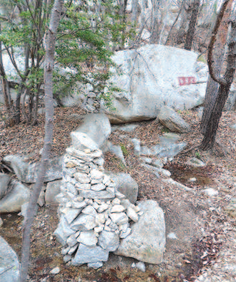 바위 아래에는 바로 위의 좁은 계곡에서 내려온 듯한 물이 괴어 있지만 식수로는 쓸 수 없다. 바위 뒤로 조금 떨어진 바위에는 칠성굴(七星窟)이라고 새겨놓았다. 아랫마을 토박이 들의 오래된 기도터인 듯싶다.