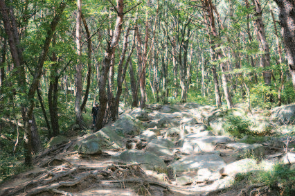 주변의 분위기도 올라갈수록 바뀌어 소나무 숲은 점점 적어지면서 잡목들의 수가 많아진다. 굵은 돌이 깔린 오른쪽 길을 따라 10여분을 오르면 왼쪽으로 갈림길이 나있다. 길 오른쪽에 높이 2m 정도의 바위에 흰 글씨로 龍皇堂(용황당)이라 쓰여 있고 그 옆에 삼산조기회라고 음각한 글씨도 보인다.