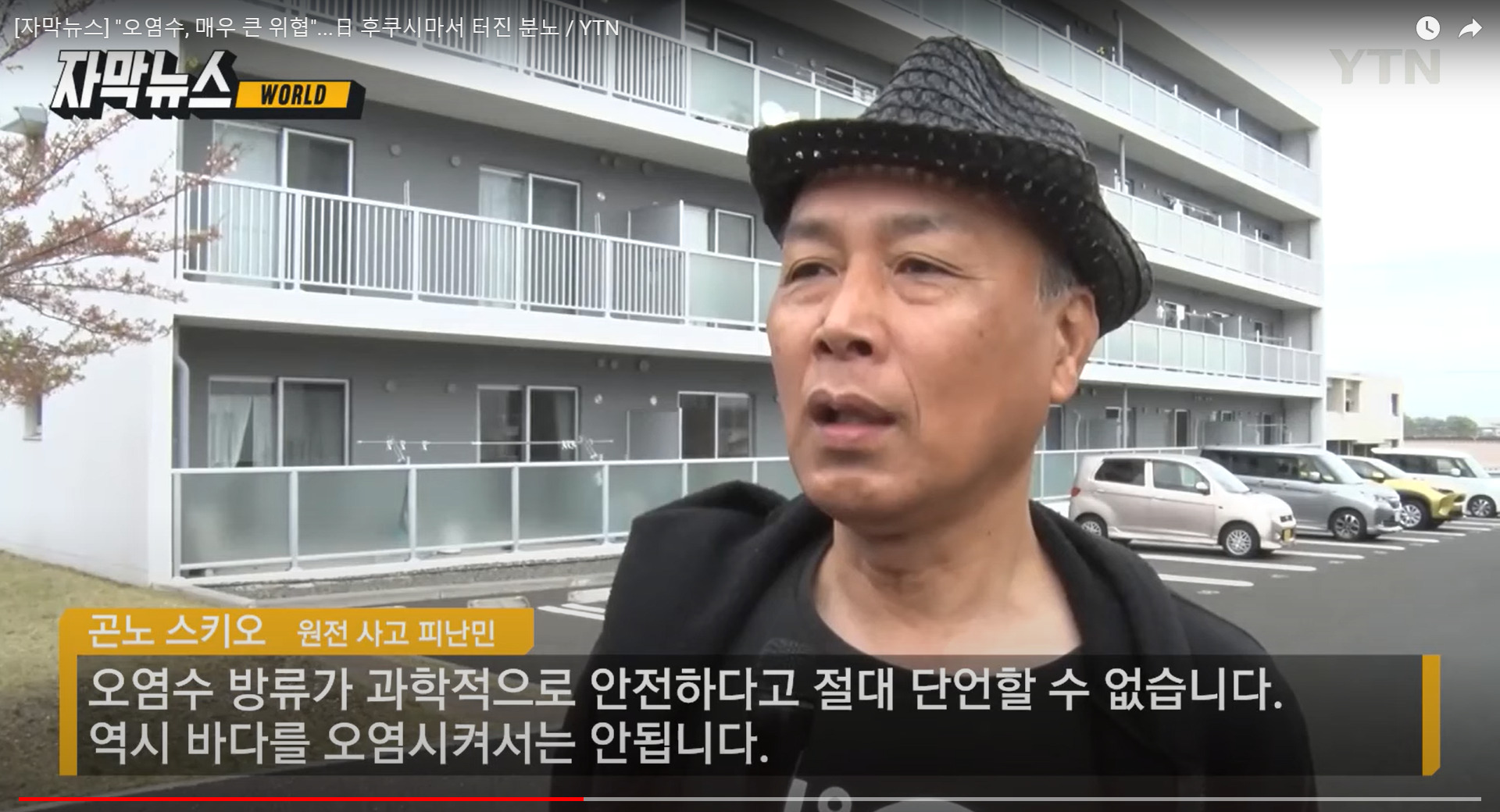 [곤노 스키오 / 원전 사고 피난민 : 오염수 방류가 과학적으로 안전하다고 절대 단언할 수 없습니다. 역시 바다를 오염시켜서는 안됩니다.]