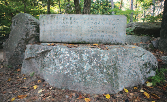등산로는 겨울에도 햇볕이 잘 들어오지 않을 만큼 우람한 소나무들이 들어차 있다. 금정산 곳곳에 재선충으로 소나무가 죽어가지만 여기만은 아직 그렇게 심하지 않다. 소나무 사이를 돌며 경사가 심한 산비탈을 오르느라 이마에 땀이 밸 즈음 석축이 보인다. 혹시 절터였던가 하고 올라서면 석축 아래에 여남 평의 잘 다듬어진 공터가 나온다. 높이 60cm 정도