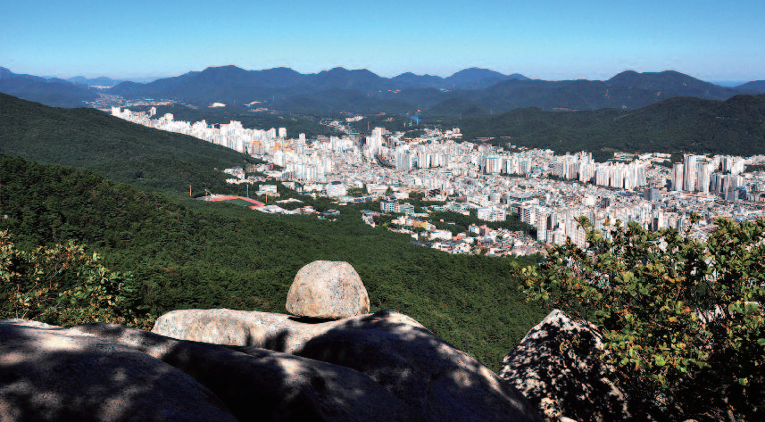 발아래의 사직운동장과 온천장 일대, 멀리 광안대교를 보며 잠깐 땀을 식히고 5분이면 능선에 올라선다. 바위사이로 돌면 오른편에 칠성암가는 길이 있다.