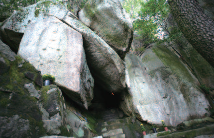 약수터에서 100m 더 올라 오른쪽 계단 위 큰 바위에 불상을 새겨놓은 기도터를 보며 2~3분가면 케이블카 철탑이 나타나고 왼편에 전망대 바위가 기다린다.