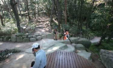 멀리서 보면 기계총으로 머리가 빠진동래·거제지역의 시가지를 내려다보면서 잠깐 숨을 돌린 다음 왼쪽의 로프웨이를 보면서 피해 지역의 오른쪽 경계선을 따라 된비알을 8~9분 오르는 동안 오른쪽 숲 속에서 올라오는 길과 두 서너 번 마주친다. 이들 길은 아래쪽의 오른쪽 우회로 에서 갈라진 것이다. 짙은 소나무 숲으로 들어가 4분이면 좌우로 등산로가 갈라지