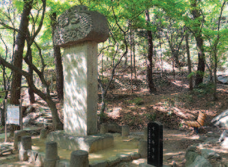 표지석 옆을 지나 연못 위의 산책로 입구에서 오른편(북쪽)으로 뻗은 산책로를 따라 2분 정도면 길가에 6각형 평상이 보인다.