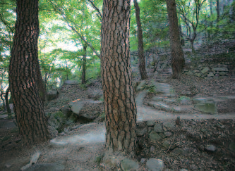 등산로는 겨울에도 햇볕이 잘 들어오지 않을 만큼 우람한 소나무들이 들어차 있다. 금정산 곳곳에 재선충으로 소나무가 죽어가지만 여기만은 아직 그렇게 심하지 않다. 소나무 사이를 돌며 경사가 심한 산비탈을 오르느라 이마에 땀이 밸 즈음 석축이 보인다. 혹시 절터였던가 하고 올라서면 석축 아래에 여남 평의 잘 다듬어진 공터가 나온다. 높이 60cm 정도
