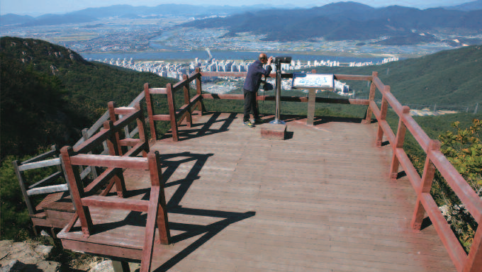 조금 쉬었으면 할 만큼 지칠 때쯤 소나무지대가 잡목이 많아지면서 등산로 오른쪽에 소나무 그늘 아래 혼자 쉬기 알맞은 전망대가 있다. 낙동강 건너 대저일대가 훤히 내려다보인다. 잠깐 쉰 다음