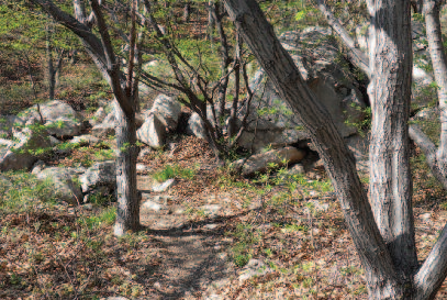 갈림길을 지나면서 오른쪽으로 희미한 길이 여럿 있지만 등산로는 아니다. 그대로 5분 정도가면 왼쪽으로 산성이 건너다보이는 내리막의 희미한 오솔길이 있다. 파리봉으로 가는 지름길이다. 곧바로 5분가면 산성을 넘어 제1망루터 앞 에 서게 된다.