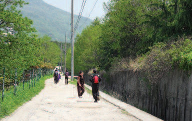 채소밭 옆으로 30m가량 오르면 바로 솔밭 속의 된비알이다. 3~4분 뒤 이마에 땀이 밸 즈음이면 왼편에 송전철탑, 오른쪽 아래에 계단식 채전이 보이면서 평지길이다. 얼마 안 가 오른쪽 갈림길 이 나오지만 무시하고 그대로 가면 곧 오르막이 시작된다.