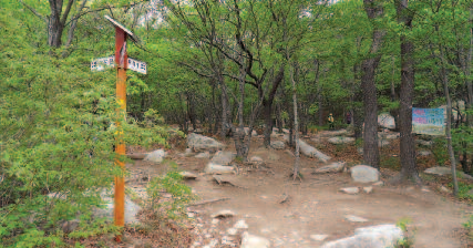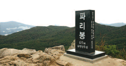 길가의 등산로 표시대로 왼쪽의 넓은 길로 방향을 바꾸면 바닥이 큰 돌투성이의 험한 길이 시작되지만 곧 걷기 편한 넓은 산책길로 변한다. 계곡을 건너면서 잡목림이 많아지고 주변에는 바위들도 많다. 이어 간단한 체육시설이 있는 쉼터에 닿게 되는데 오른쪽으로 희미한 능선길이 나 있다. 파리봉으로 오르는 지름길이 다. 넓은 길을 따라 5~6분 가면 소나무에 기댄 듯한 케른이 서 있다.