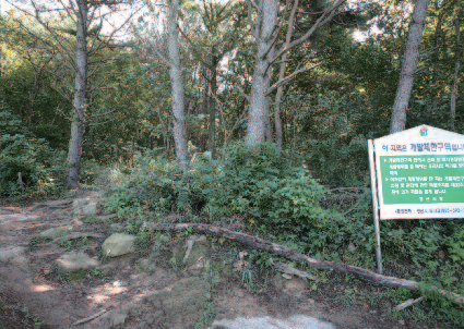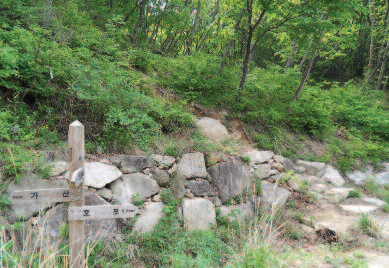 등산로는 길 건너 오른쪽으로 10m 떨어진 곳에 열려있다. 산죽사이로 올라서면 곧 갈림길이 나오고 좌우 양쪽에 이정표가 서있다. 어느 쪽으로 가도 거리는 비슷하다.