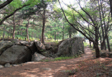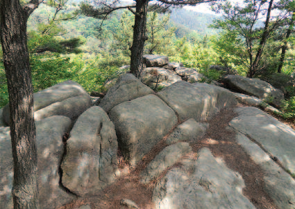 바로 위에 바위가 많아 등산로가 이리저리 갈라지지만 어느 쪽으로 가도 마찬가지다. 바위지대를 벗어나 잡목 사잇길을 따라가면 왼편으로 길이 갈라지지만 따라가 보면 바위 위의 쉼터다. 그대로 4~5분 가면 넓은 등산로와 만난다. 서쪽 성벽으로 가려면 넓은 등산로를 가로질러 방향을 바꾸지 않고 그대로 숲속으로 들어가 3~4분이면 성벽에 올라선다.