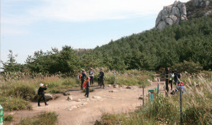 산 중복 오른쪽을 가로질러 산죽지대 위쪽을 지나 능선을 따라 바로 직등한다. 다시 오른쪽으로 방향을 바꿔 능선모퉁이를 돌아가면 소나무 숲길이 동쪽으로 완만하게 뻗어 있다.