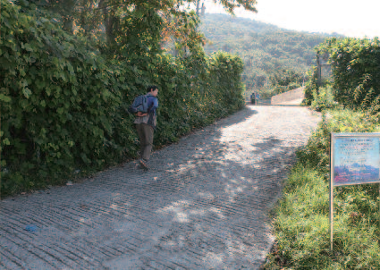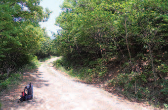 다리를 건너면 시멘트포장도로가 밭 사이로 산 밑까지 이어져 있다. 5분도 채안 되어 밭을 벗어나 산길로 접어든다. 3~4분이면 다시 작은 채소밭 옆을 지나게 되고 바로 위 오른쪽에서 소로가 갈라진다. 이를 무시하고 뚜렷한 왼쪽 길을 따라 오르면 세 번째의 제법 넓은 채소밭과 바로 위의 묘지 두 기 옆을 지나 본격적인 등산이 시작된다.