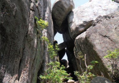 거대한 바위벽 앞을 지나 너덜겅을 타고 나아가 능선에 올라서면 넓은 공터가 있고 반대쪽 계곡에서 올라오는 샛길도 보인다. 능선을 2분 오르면 로프가 걸린 바위가 앞을 막는다. 오른쪽의 안전한 길로 돌아 오르면 주변은 산죽이 있는 급경사다.