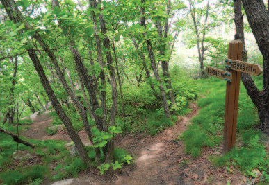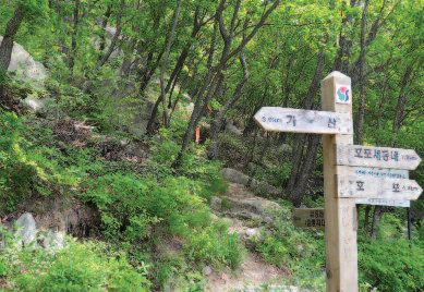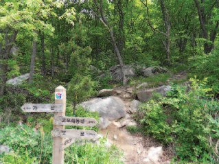 자칫하면 길을 잃어 헤매기 쉬우므로 자주 리본을 찾아 앞길을 확인하면서 나아가는 것이 요령이다. 계곡에 들어서서 10여분이면 부채를 닮은 큰 바위 못미쳐 이정표 앞에 서게 된다.