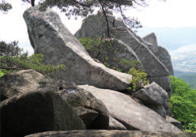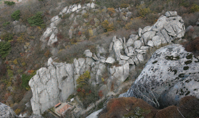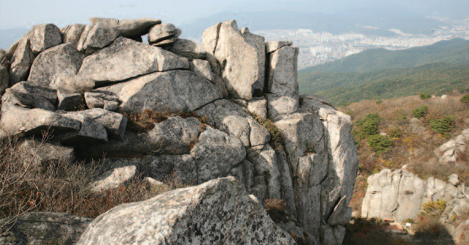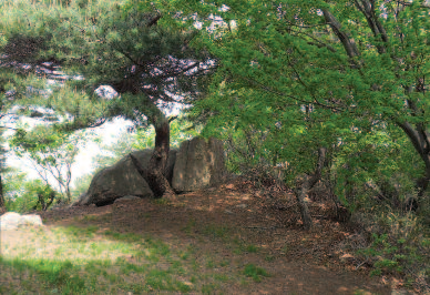 잠깐 숨을 돌리고 일어서면 곧 거대한 바위가 앞을 가로막는다. 왼편으로 난 길로 돌아가면 나무계단이 있다. 67계단이다. 능선에 올라서서 10여분 가면 또 앞을 막는 바위더미 왼쪽으로 돌면 잘 손질된 넓고 큰 묘 한 기가 있다.