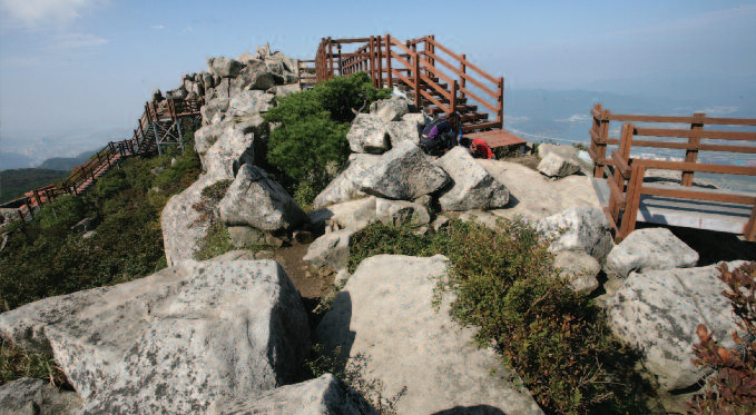 능선에 올라서면 대개 오르기가 수월한데 여기서는 그렇지 않다. 계속 가쁜 숨을 내쉬면서 로프를 잡고 올라야 왼편에 전망이 좋은 너럭바위가 있다. 바위에 올라서면 건너편 능선이 한눈에 들어온다.