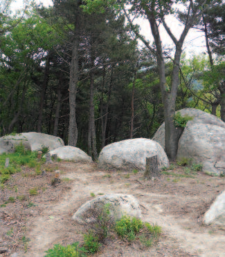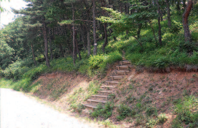 능선을 잇는 희미한 산길을 따라 10여분을 가다 왼쪽으로 방향을 바꿔 얼마안가 내리막이 시작되고 곧 다시 임도에 내려서게 된다. 동남쪽으로 뻗은 임도가 끝나면서 묘지 뒤로 등산로가 열려있다.