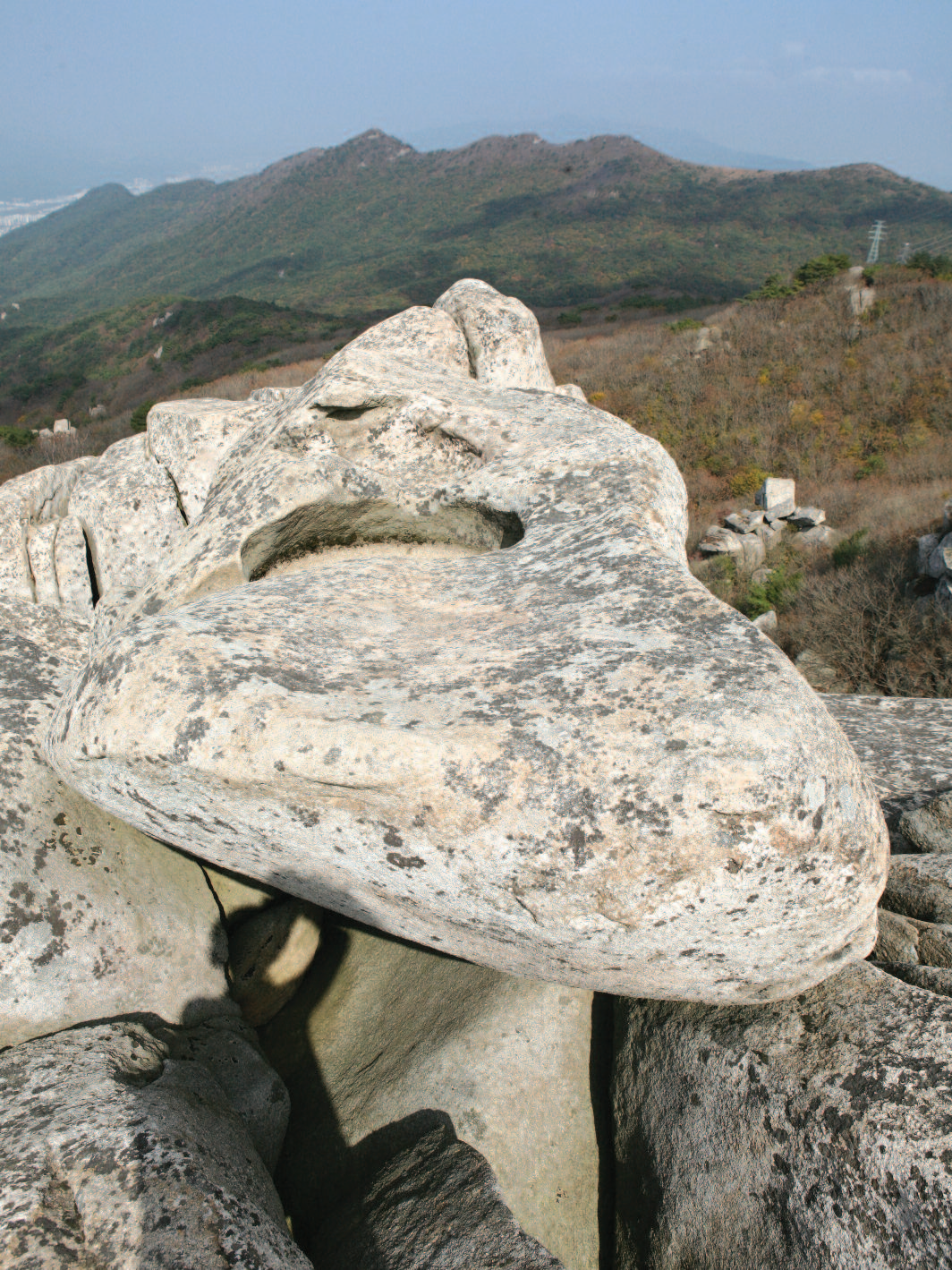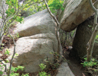 오르락내리락하지만 걷기 좋은 산길을 15분 정도 오르면 거대한 바위가 능선을 가득 메웠고 등산로는 바위 왼쪽으로 계속된다. 7~8분 가쁜 숨을 내쉬며 한 봉우리에 올라서면 또 다른 봉우리가 기다리고 있다. 팽팽한 긴장 속에 여러 차례 바위를 오르내린 다음 산죽 사이를 헤치며 20분 정도 오르면 능선은 끝나고 내리막길이 기다린다. 오른쪽 아래로 조금 내려가면 갈림길이다. 바로 내려가면 마애불로 이어진다. 왼쪽의 위로 오르는 길을 따라가면 개구멍 같은 바위사이를 지난다.