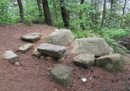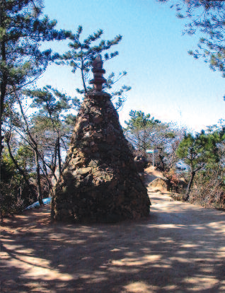 주변이 온통 바위지대가 되면서 경사도 심하고 소나무에서 오리나무 붉나무 등 잡목이 늘어난다. 5분정도 걸으면 평지 같은 능선 길이 5분간 계속되다 앞에 돌로 쌓은 큰 탑이 있는 공지가 나온다.
