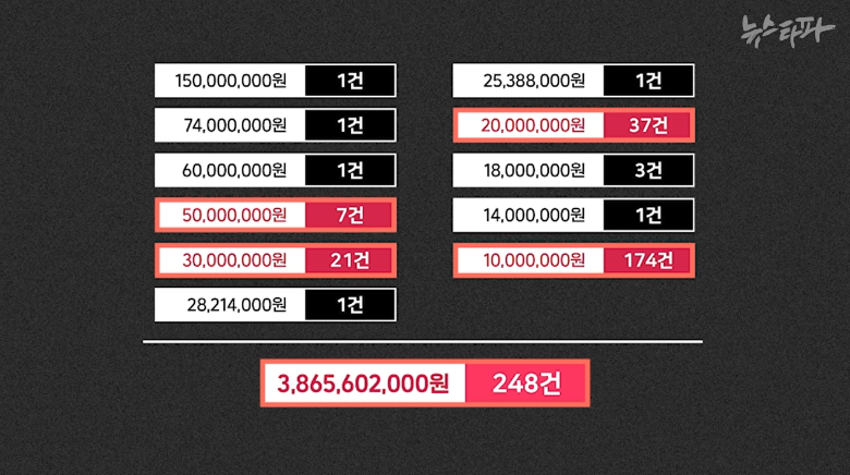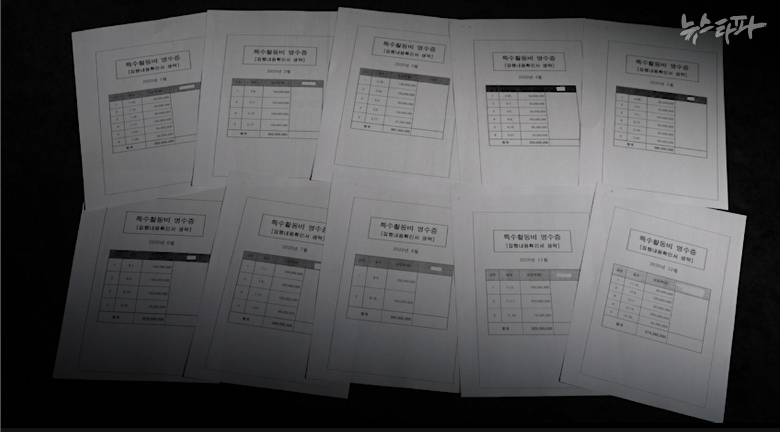 뉴스타파가 지금까지 확보한 윤석열 특수활동비 예산 자료 17개월 치를 분석한 결과, A4 1장짜리 집행내용확인서 같은 부실한 지출증빙만 남기고, 전액 현금으로 한 번에 1천만 원 이상을 집행한 사례는 모두 248건으로 나타났다. 1천만 원 174건, 2천만 원 37건, 3천만 원 21건, 5천만 원 7건이었다.