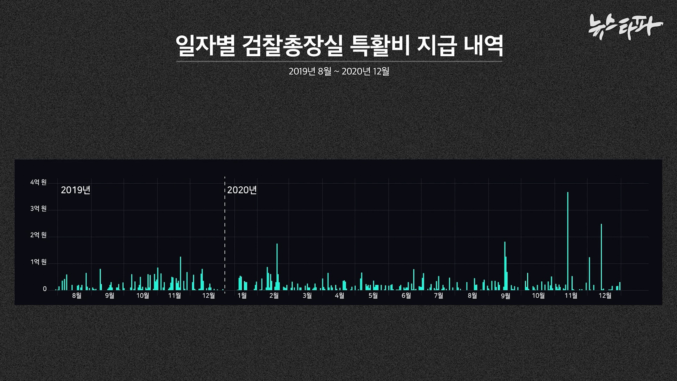 뉴스타파는 정보공개 청구를 통해 지난 1월, 대검찰청으로부터 2020년 하반기(7~12월)에 생산된 대검 특활비 지출 증빙기록을 확보해 분석했다. 기록에 따르면, 윤석열 검찰총장은 2020년 11월 총장 비서실이 현금으로 조성해 별도 관리하는 이른바 ‘검찰총장 몫’ 특활비 5억 6,871만 4,000원을 모두 120명에게 나눠 지급했다. 그런데 이 가운데 11월 13일 하루 동안 3억 6,800만 원을 80명에게 나눠 준 사실이 ‘검찰총장 특수활동비 집행내역’, 즉 검찰총장 비서실이 작성한 ‘검찰총장 몫’ 특활비 장부를 통해 확인됐다.