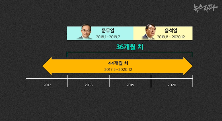 지금까지 뉴스타파가 확보한 검찰총장 특수활동비 자료 44개월(2017.5.~2020.12.) 치 중, 집행내용확인서 생략 자료가 첨부돼 있는 건 36개월(2018.1~2020.12) 분량이다. 이 기간 검찰총장은 문무일, 윤석열 대통령, 두 명이다.