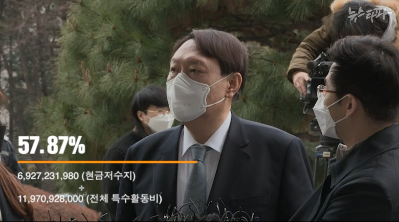 뉴스타파가 윤석열 대통령의 검찰총장 재임 시절 대검찰청에서 생산한 특수활동비 지출 기록을 분석한 결과, 재임 20개월 중 17개월간 당시 윤 총장이 비서실로 현금화해 옮겨 두고 쓴 이른바 특수활동비 ‘현금 저수지’의 규모가 69억 2,723만 1,980원으로 추산됐다. 해당 기간 검찰에 배정된 전체 특수활동비 예산의 약 60%를 차지하는 금액으로, 전임 문무일 총장(41%)의 현금 저수지보다 규모가 훨씬 크다.
