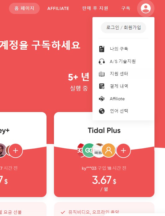 결제 완료 후 나의 구독을 가 보면 아래와 같이 사용자이름과 비밀번호가 있다.