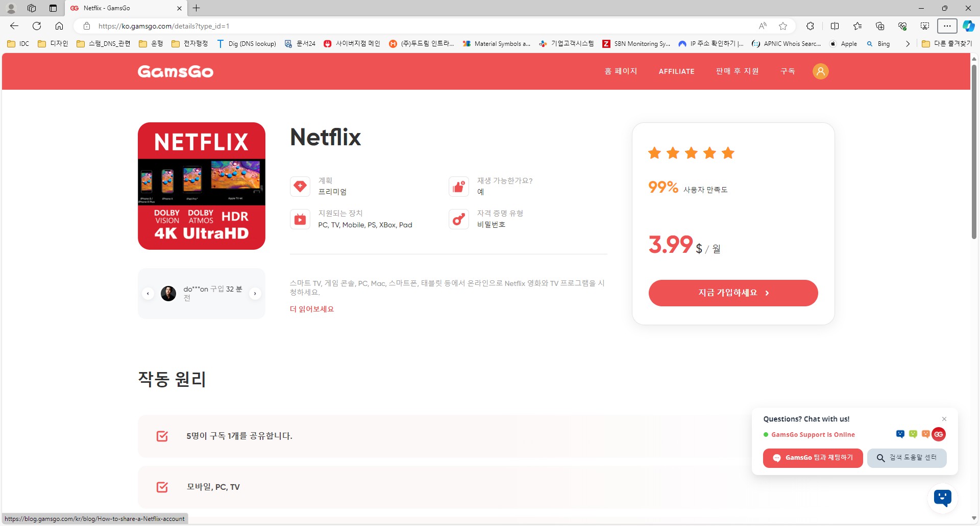 가장 많은 사용자가 이용하는 아이디 공유사이트인 겜스고(Gamsgo)를 이용하면, 한달에 약 3.8달러. 약5000원의 저렴한 가격에 4K화질의 넷플릭스 등을 이용할 수 있다.