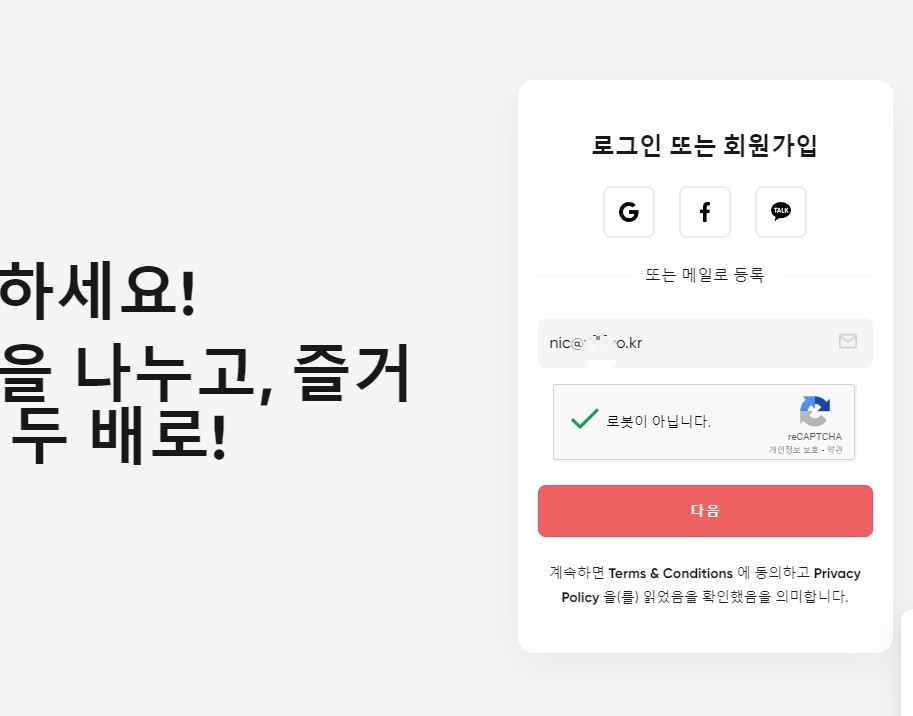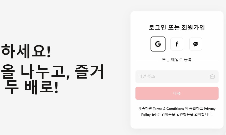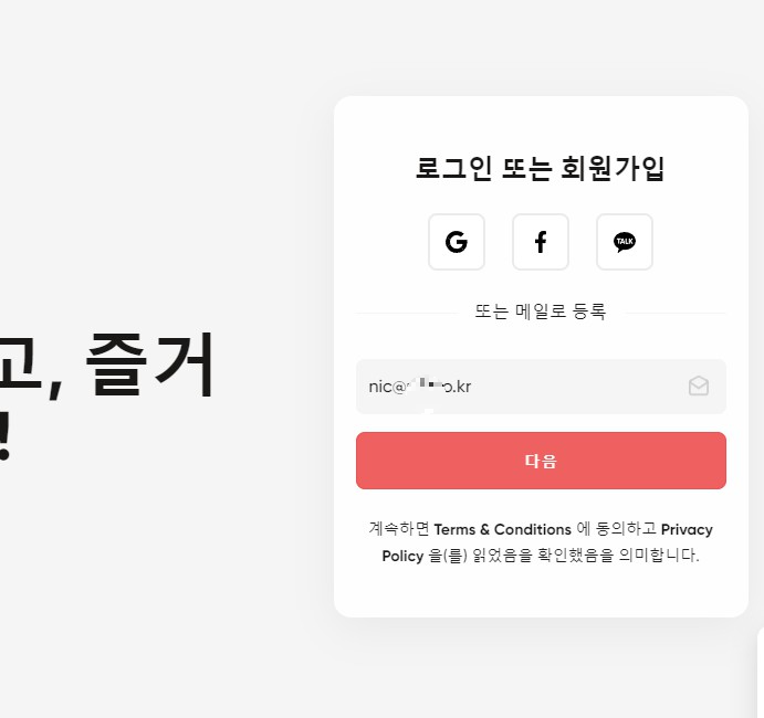 손쉽게 구글메일이나 SNS계정으로 가입해도 되고, 별도의 이메일 주소를 입력 후 가입하여도 된다.