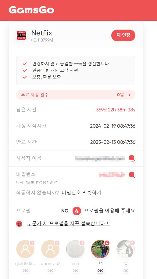 By using Gamsgo, the most widely used ID sharing site, you can access services like Netflix in 4K quality for about $3.8 per month, approximately 5,000 won. Currently, the monthly fee for 4K streaming in South Korea is 17,000 won for up to 5 profiles.