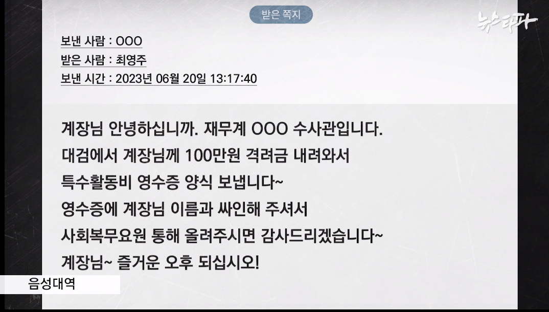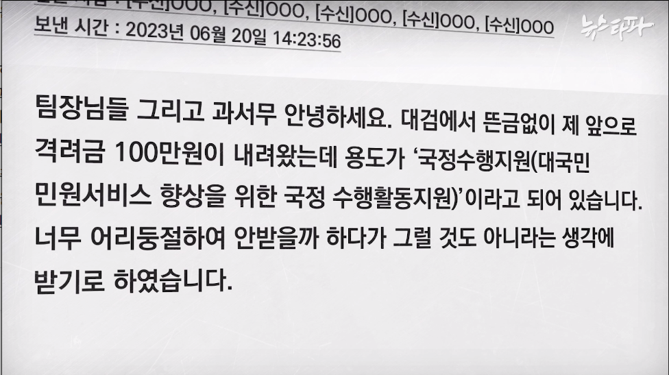 총무과 직원의 메신지를 받고 몇 분 뒤, 이번엔 천안지청 재무 담당자의 메시지가 왔다. 대검찰청에서 100만 원의 격려금이 내려왔으니 특수활동비 영수증에 서명해 보내달라는 요청이었다.