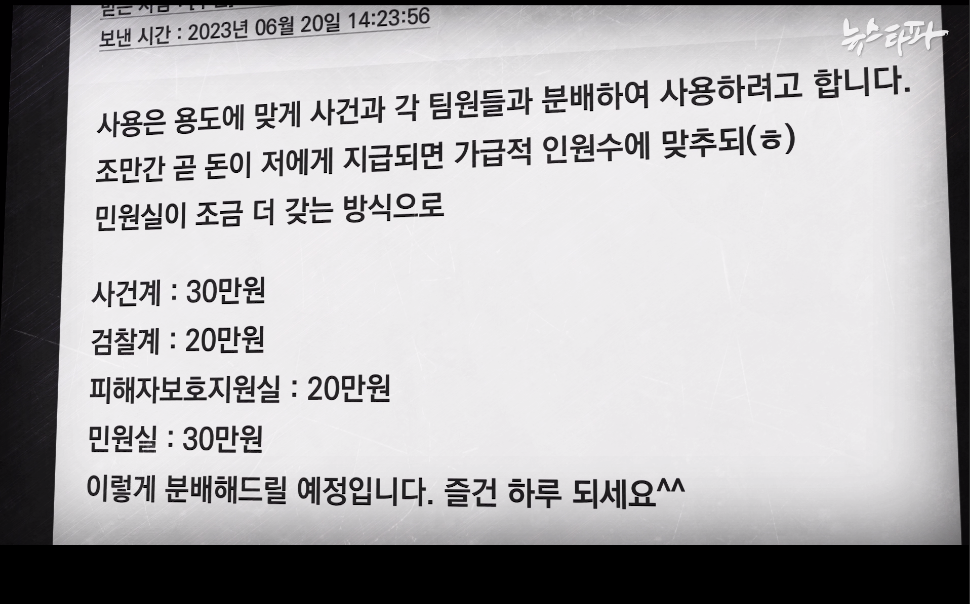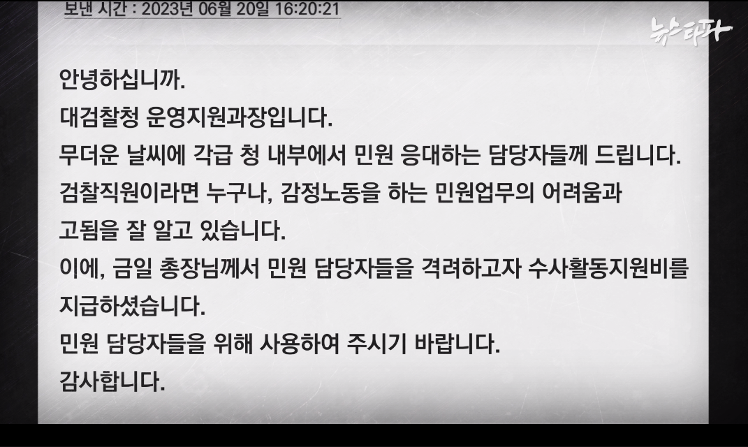 통화를 끊고 얼마 지나지 않아, 이원석 검찰총장이 천안지청 말고도 전국 검찰청 민원실에 일제히 특활비를 내려보냈음을 보여주는 검찰 내부 자료가 확보됐다. 2023년 6월 20일, 오후 4시 20분. 검찰 내부 통신망 이프로스로 최영주 전 실장에게 메시지가 왔다. 작성 주체는 ‘대검찰청 운영지원과장’이었고, 각급 검찰청의 민원 담당자들에게 메시지를 보내는 것으로 돼 있다. 그 내용은 “금일 (이원석) 총장님께서 민원 담당자들을 격려하고자 수사활동지원비(특활비)를 지급”했다는 것이다.