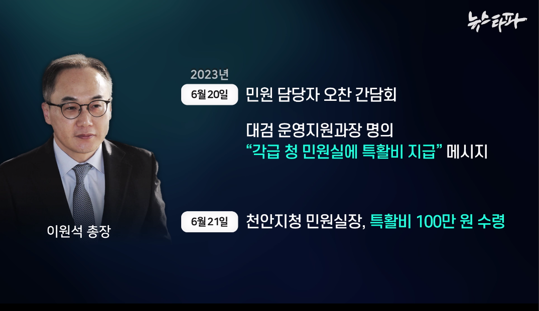 2023년 6월 20일 전후로 이원석 검찰총장이 천안지청뿐 아니라 전국 각급 검찰청 민원실 직원들에게도 특활비를 직접 뿌렸음을 보여주는 검찰 내부 자료가 처음으로 확보된 것이다.
