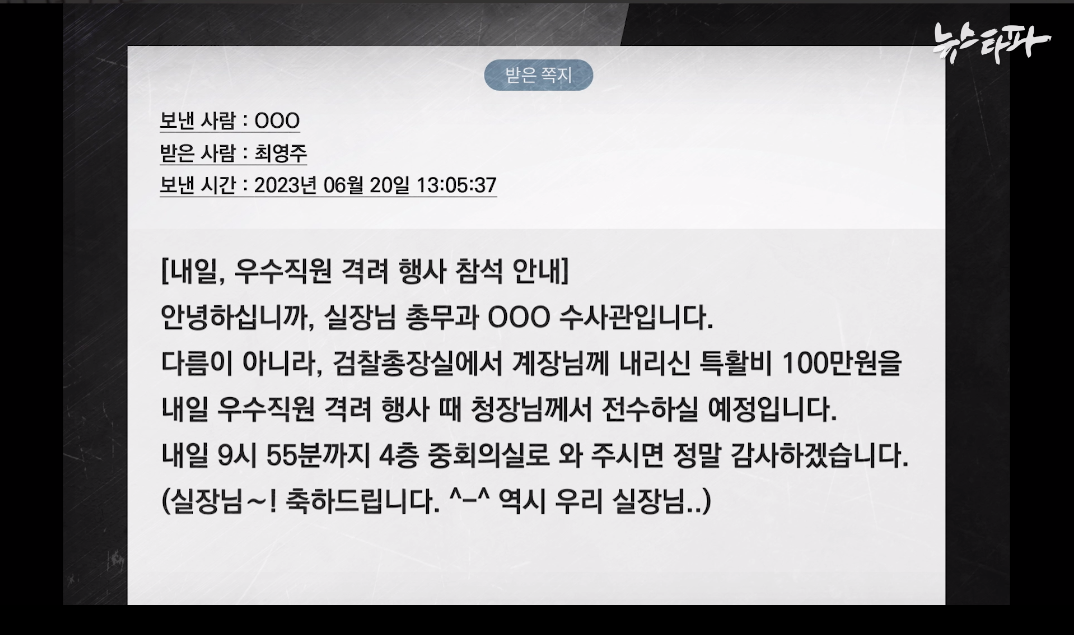 지난해 6월 20일 오후 1시 5분. 검찰 내부 통신망인 이프로스에 대전지검 천안지청 최영주 민원실장 앞으로 메시지가 도착했다. 천안지청 총무과 동료 직원이 보낸 것. 제목은 “내일 우수직원 격려 행사 참석 안내”였다. 자신이 우수 직원으로 선정돼 검찰총장으로부터 특수활동비 100만 원을 받게 됐다는 것이다. 총무과 직원의 표현을 그대로 하자면, “검찰총장실에서 계장님께 내리신 특활비 100만원”을 내일, 우수직원 격려 행사 때 “(지)청장님께서 전수하실 예정”이라고 했다.